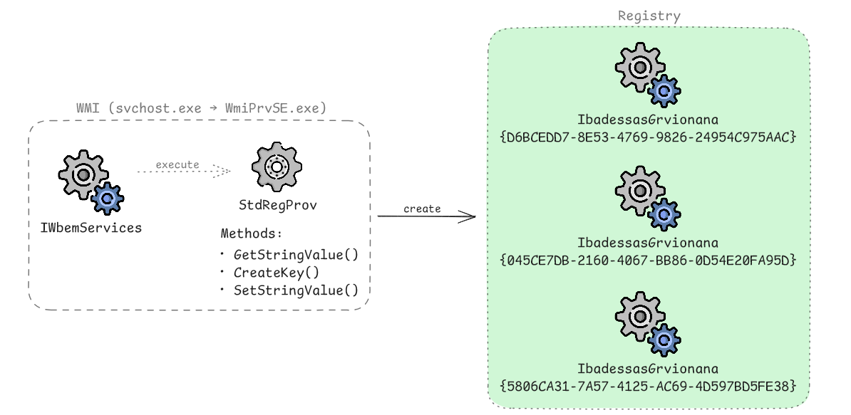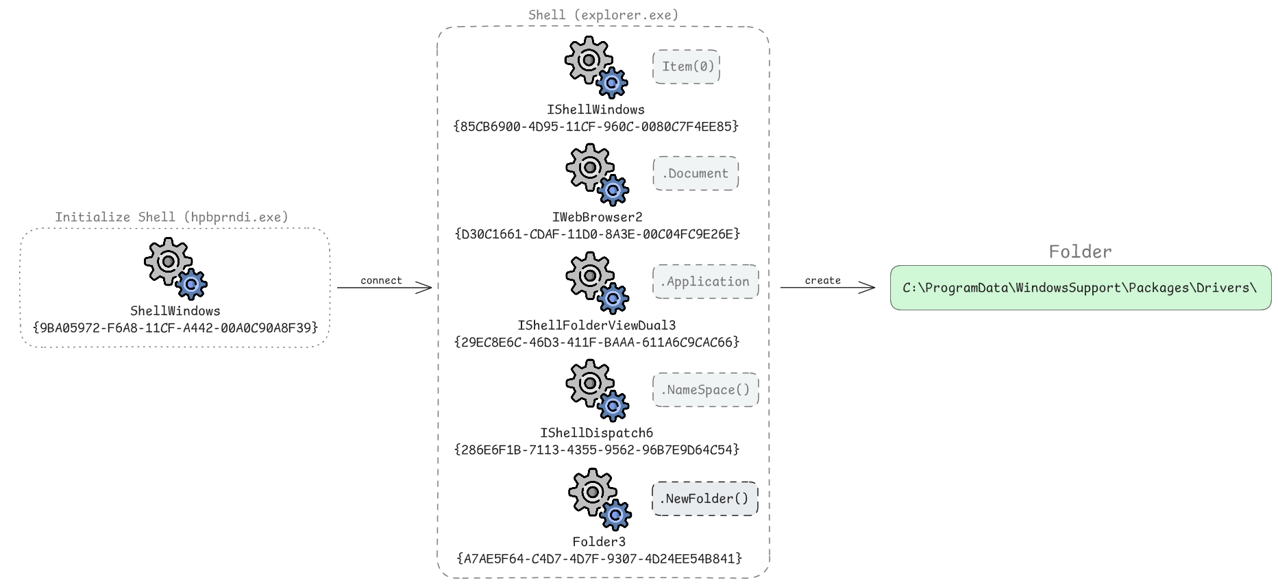 The following illustration (icon source) shows the simplified file execution chain when the legitimate signed printer driver installer hpbprndi.exe is run by the VBScript file: