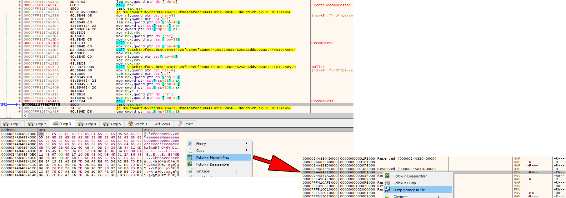 As initially described, when you analyze a loader or multi-stage malware sample, there’s usually a raw PE file written to a memory buffer at some point. The following x64dbg screenshots show the XOR encrypted first stage EXE payload in the Dump 3 window: