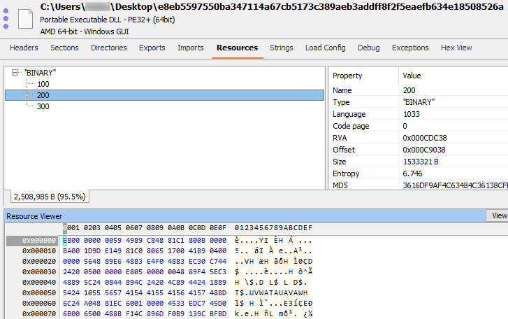 The resources named 100 and 300 are the signed ICManagement.dll and DetectionFeedback.dll files from Sophos. The resource named 200 is the reflective loader shellcode with the embedded Cobalt Strike loader named astraGem.dll. This file contains the additional signed Windows files MessagingDataModel2.dll and midimap.dll in its resource section.