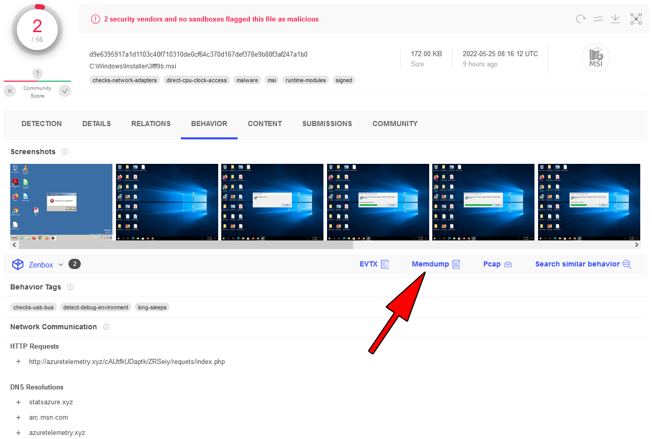 The following Virutotal screenshot shows the option to download the memdump of this file: