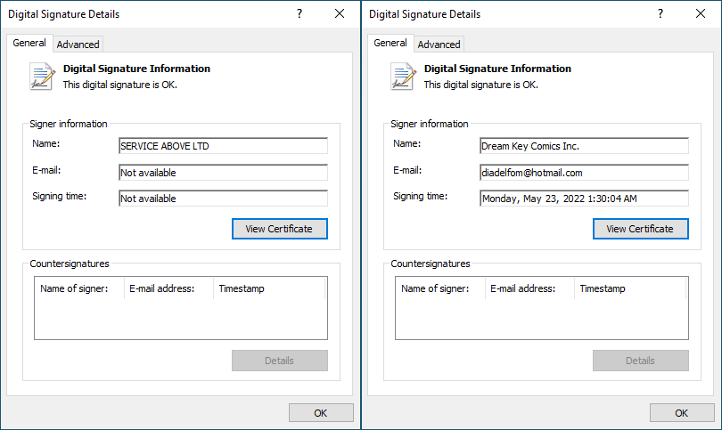 It’s a signed MSI file disguised as a Symantec Protection Engine installer and contains two files. The first file named notify.vbs shows a fake error message when run. The second file named main.dll is a signed Matanbuchus loader disguised as a Visual Studio installer. The signatures are as follows (MSI file on the left, main.dll on the right):